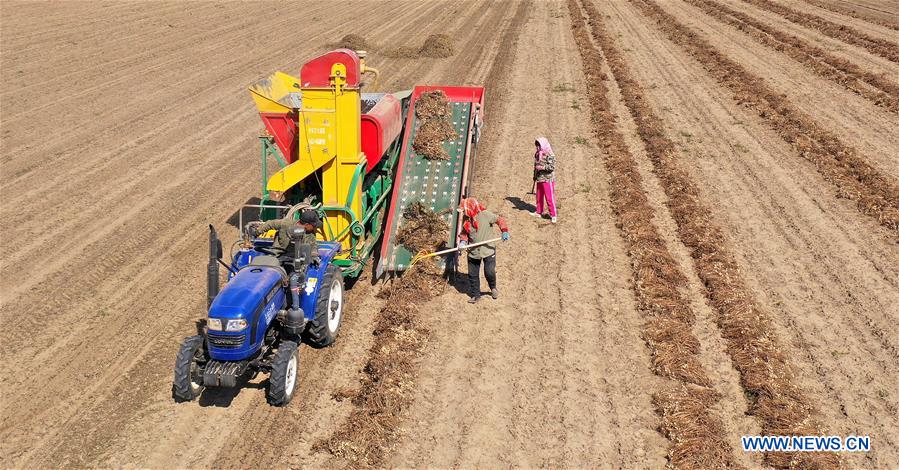 Aerial photo taken on Sept. 23, 2020 shows villagers harvesting peanuts in a field in Sanglin Village, Anshan City, northeast China's Liaoning Province. (Xinhua/Yao Jianfeng)