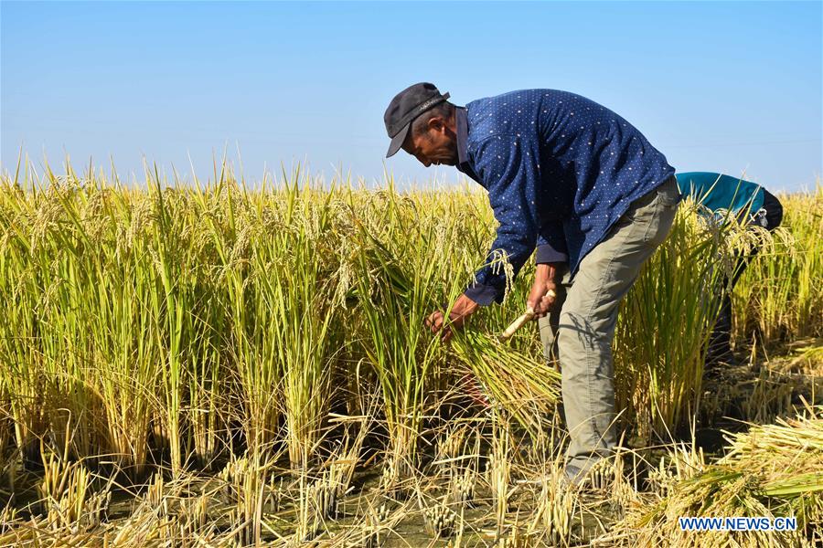 Growers harvest saline soil rice paddies in the field at Bayiawati Township, Yopurga County in Kashgar, northwest China's Xinjiang Uygur Autonomous Region, Sept. 25, 2020. A public yield monitoring was conducted Friday in the saline soil rice paddies on the western margin of the Taklimakan Desert in Xinjiang Uygur Autonomous Region. The saline soil rice, developed by the R&D team of Yuan Longping, the pioneer of hybrid rice, achieved a theoretical yield of 548.53 kg per mu (about 0.07 hectares). (Xinhua/Gao Han)