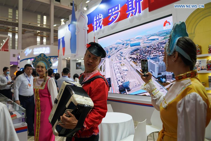 Representatives from Russia take photos during the 2020 Maritime Silk Road Culture and Tourism Expo (Ningbo China) at Ningbo International Conference and Exhibition Center in Ningbo, east China's Zhejiang Province, Sept. 25, 2020. The expo kicked off here on Sept. 25 and will last till Sept. 27. (Xinhua/Yin Xiaosheng)