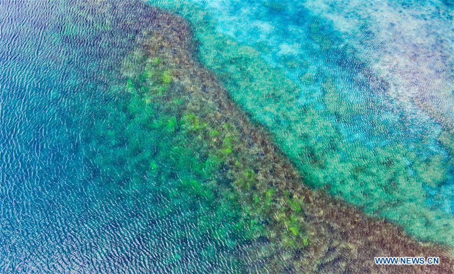 Photo taken with a drone shows the "black lake" of the "three-colored lakes" in Puyu Village of Banbar County, Qamdo, southwest China's Tibet Autonomous Region, Sept. 26, 2020. The "three-colored lakes" in Banbar County are comprised of three hill-seperated ponds which display black, white and yellow colors due to their varying depths and sediments. (Xinhua/Jigme Dorje)