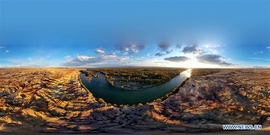 Aerial photo taken on Sept. 26, 2020 shows a panoramic view of the Colorful Beach scenic area and Irtysh River in Burqin County, northwest China's Xinjiang Uygur Autonomous Region. (Xinhua/Sadat)