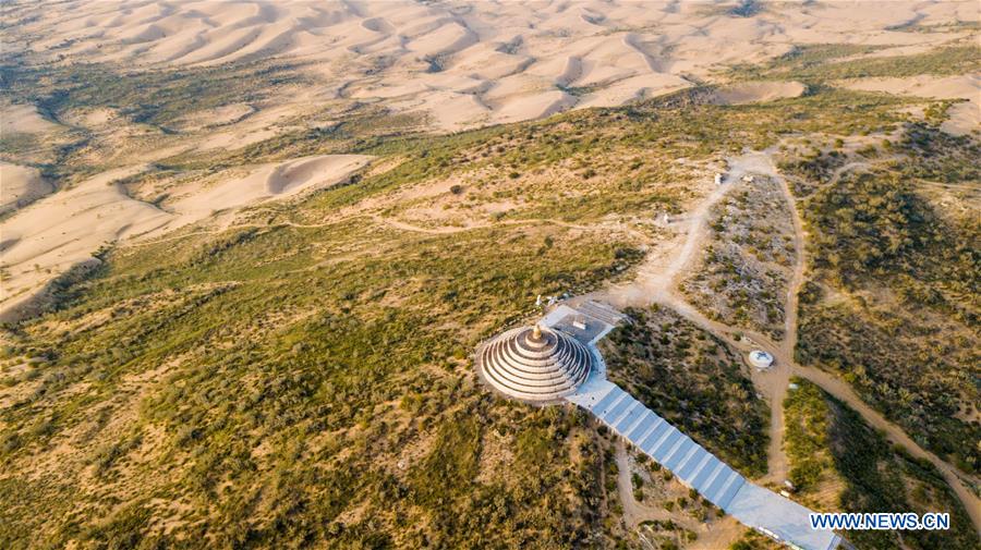 Aerial photo taken on July 31, 2018 shows a sand-fixing forest in Dalad Banner of Ordos of north China's Inner Mongolia Autonomous Region. Kubuqi Desert, located in the Ordos plateau, has an area of about 18,600 square kilometers. Once being totally barren and was called the "sea of death", the desert, however, now has a green area of more than 3,200 square kilometers thanks to the efforts of local people, enterprises and government. In 2014, The United Nations Environment Program (UNEP) announced that Kubuqi Desert is an ecological economy demonstration zone, showing the experience and wisdom of Chinese people in the action. (Xinhua/Peng Yuan)
