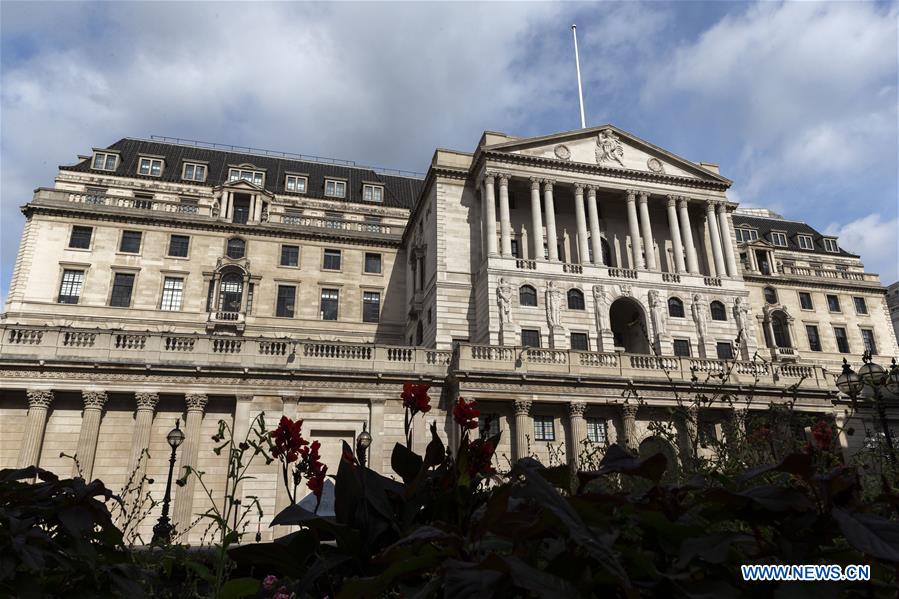 Photo taken on Sept. 12, 2020 shows a general view of the Bank of England in London, Britain. Britain's gross domestic product (GDP) recorded the third consecutive monthly rise in July 2020 but remained far below the pre-pandemic levels, the Office for National Statistics (ONS) said Friday. (Xinhua/Han Yan)