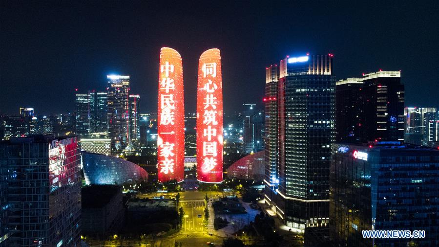 Aerial photo taken on Sept. 29, 2020 shows a light show staged at buildings in Chengdu Financial City in Chengdu, capital of southwest China's Sichuan Province. A series of light and projection shows take place in Chengdu every night from Sept. 29 to Oct. 10. (Photo by Zhang Kefan/Xinhua)