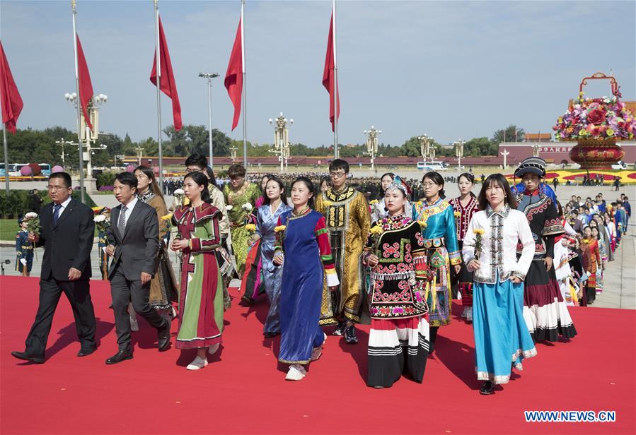 A ceremony presenting flower baskets to deceased national heroes is held at Tian'anmen Square to mark the Martyrs' Day in Beijing, capital of China, Sept. 30, 2020. (Xinhua/Wang Ye)