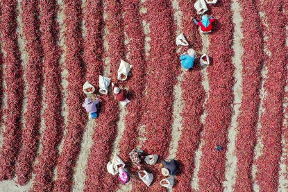 Farmers dry, sort and pack chilies in a village in Wulanzaigesen township, Bohu county, northwest China's Xinjiang Uygur Autonomous Region, Sept. 28. Photo by Nian Lei, People’s Daily Online