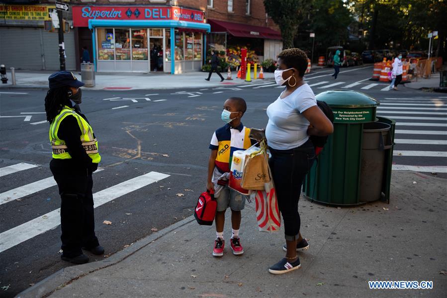 A student is informed by a crossing guard of the temporary closure of the public school PS 139 in the Ditmas Park neighborhood in Brooklyn of New York, the United States, on Oct. 8, 2020. The latest coronavirus positivity rate in the 20 hotspot ZIP codes in Queens, Brooklyn, Orange and Rockland counties in New York State was 5.8 percent, more than five times the statewide positivity rate excluding these ZIP codes which stood at 1.01 percent, tweeted Governor Andrew Cuomo on Thursday. Shutdowns of non-essential businesses, schools and social gatherings in those hotspot areas have gradually taken effect this week under the instructions of the governor and New York City Mayor Bill de Blasio, though it has triggered criticism and protests from certain groups and some parents. (Photo by Michael Nagle/Xinhua)