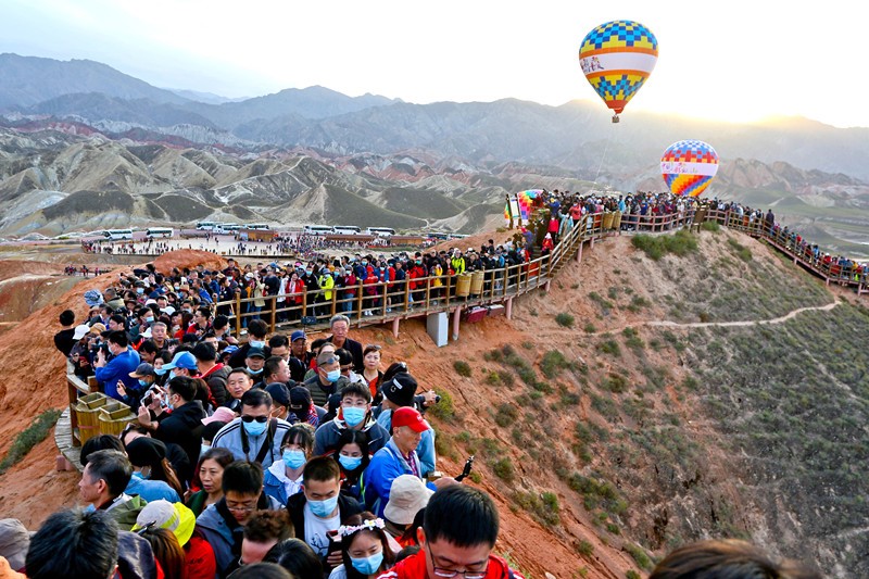 Photo taken on Oct. 1 shows a crowed plank road in Danxia Scenic Area in Zhangye, Northwest China’s Gansu Province. Photo by Wang Jiang/People’s Daily Online