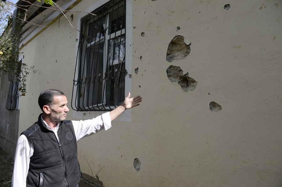 A man shows bullet and shell holes on a house damaged during the new round of Nagorno-Karabakh conflict between Azerbaijan and Armenia in Fuzuli district of Azerbaijan, Sept. 30, 2020. (Photo by Tofik Babayev/Xinhua)