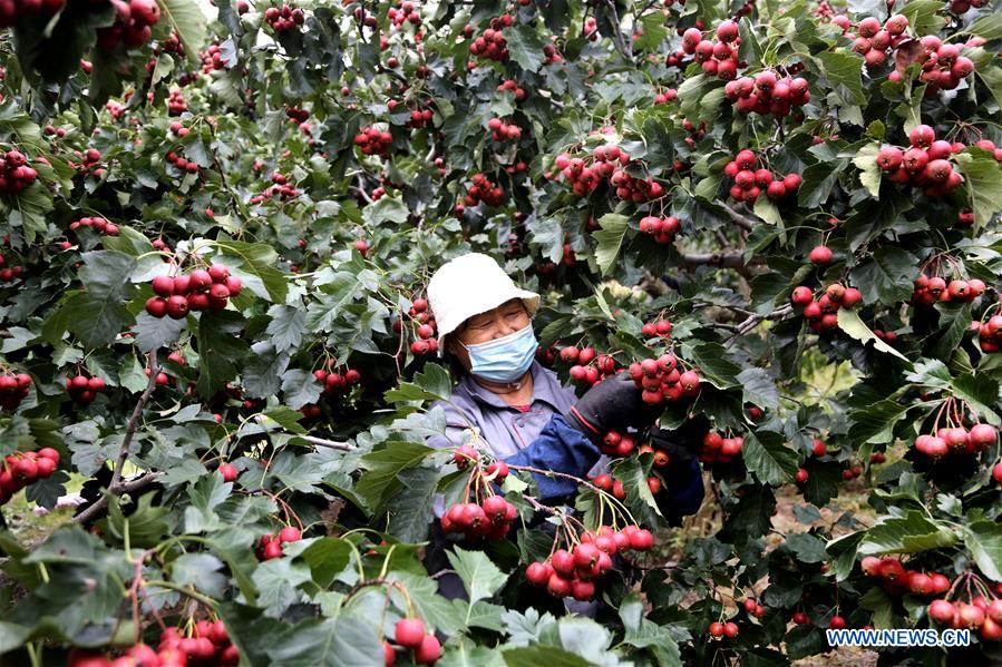A villager picks hawthorn fruits in Hanli Village of Lianyungang City, east China's Jiangsu Province, Oct. 11, 2020. (Photo by Wang Chun/Xinhua)