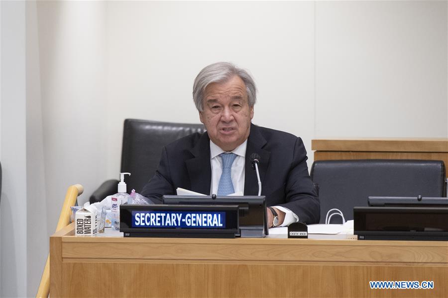 United Nations Secretary-General Antonio Guterres addresses a meeting of UN General Assembly (UNGA)'s Fifth Committee at the UN headquarters in New York, on Oct. 12, 2020. Antonio Guterres said on Monday that 2.99 billion U.S. dollars is needed in 2021 to fully implement the mandates entrusted to the organization. (Eskinder Debebe/UN Photo/Handout via Xinhua)