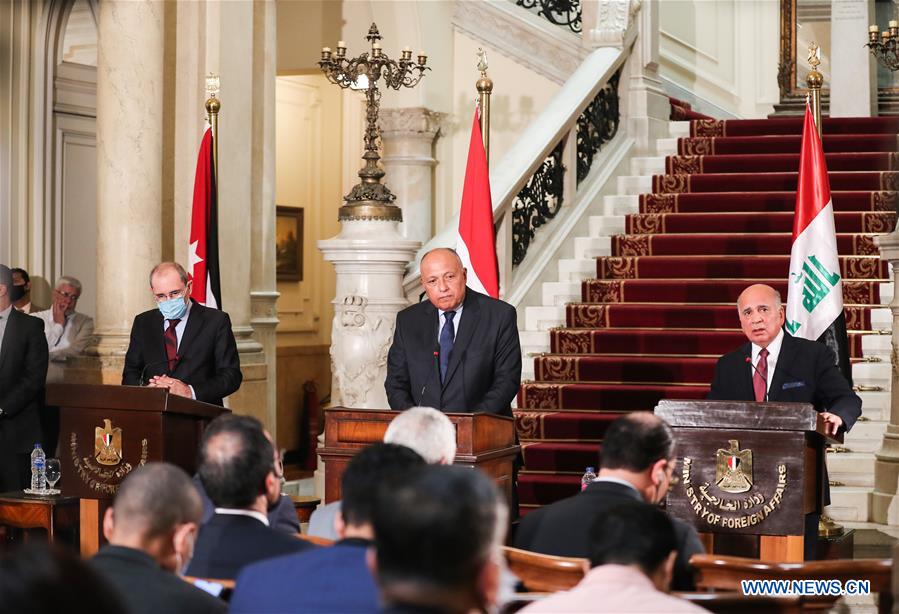 Egyptian Foreign Minister Sameh Shoukry (2nd R, Rear), Jordanian Foreign Minister Ayman Safadi (3rd R, Rear) and Iraqi Foreign Minister Fuad Hussein (1st R, Rear) attend a press conference in Cairo, Egypt, on Oct. 13, 2020. Foreign ministers of Egypt, Iraq and Jordan held a meeting on Tuesday in Cairo to discuss regional issues and joint agreements among the three countries, Egypt's state-run Nile TV reported. (Str/Xinhua)