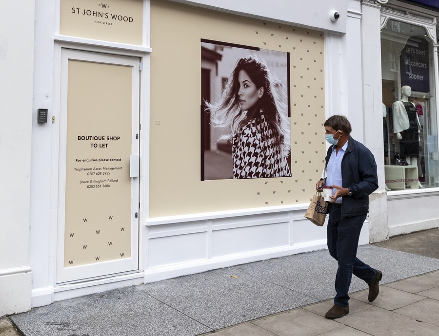 A man wearing a face mask walks past a shop in London, Britain, on Oct. 12, 2020. (Xinhua/Han Yan)