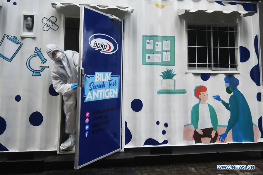 A medical worker wearing protective gear looks out of the door of a mini laboratory for COVID-19 test at Jakarta, Indonesia, Oct. 14, 2020. COVID-19 cases in Indonesia rose by 4,127 within one day to 344,749, with the death toll adding by 129 to 12,156, the Health Ministry said on Wednesday. (Xinhua/Zulkarnain)