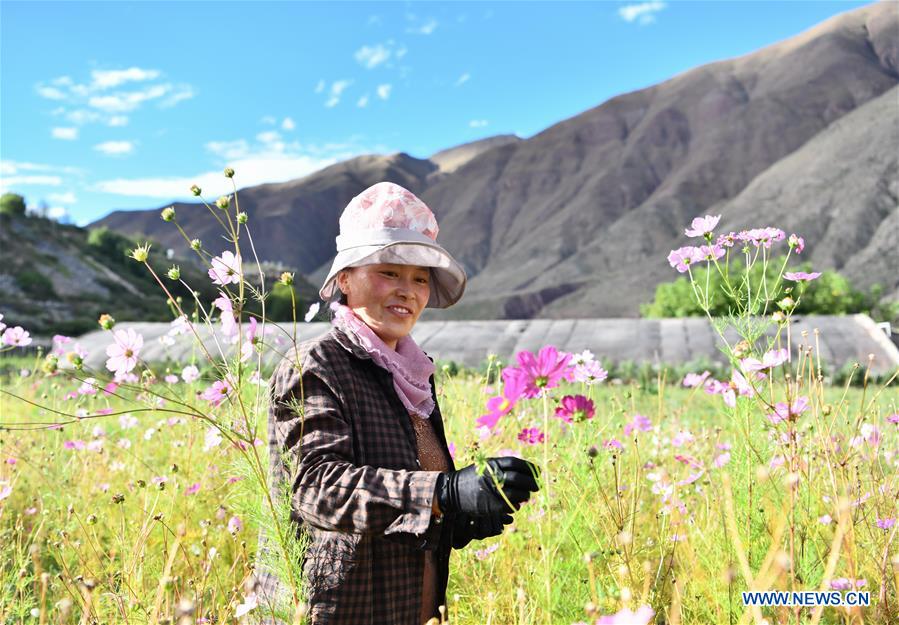 A villager collects flower seeds at a nursery industrial base in Chagyab County of Qamdo, southwest China's Tibet Autonomous Region, Sept. 28, 2020. Southwest China's Tibet Autonomous Region has accomplished the historical feat of eradicating absolute poverty, according to a press briefing held in the regional capital of Lhasa on Thursday. (Xinhua/Jigme Dorje)