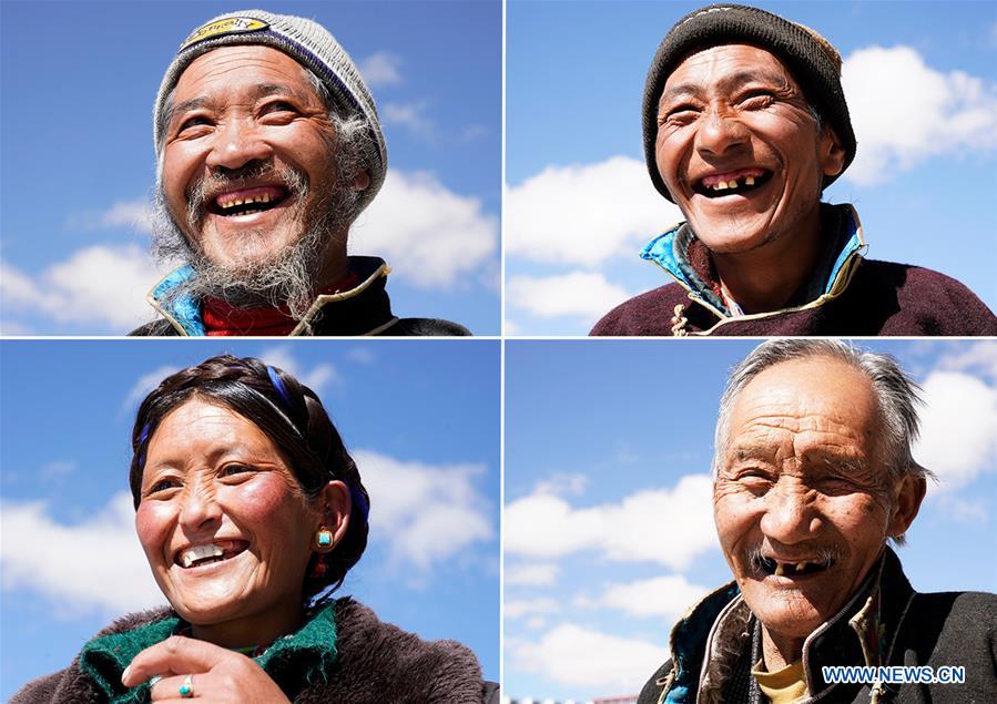 Combo photo shows villagers posing for photos in front of their new houses in Pumaqangtang Township of Shannan, southwest China's Tibet Autonomous Region, April 16, 2020. Southwest China's Tibet Autonomous Region has accomplished the historical feat of eradicating absolute poverty, according to a press briefing held in the regional capital of Lhasa on Thursday. (Xinhua/Purbu Zhaxi)