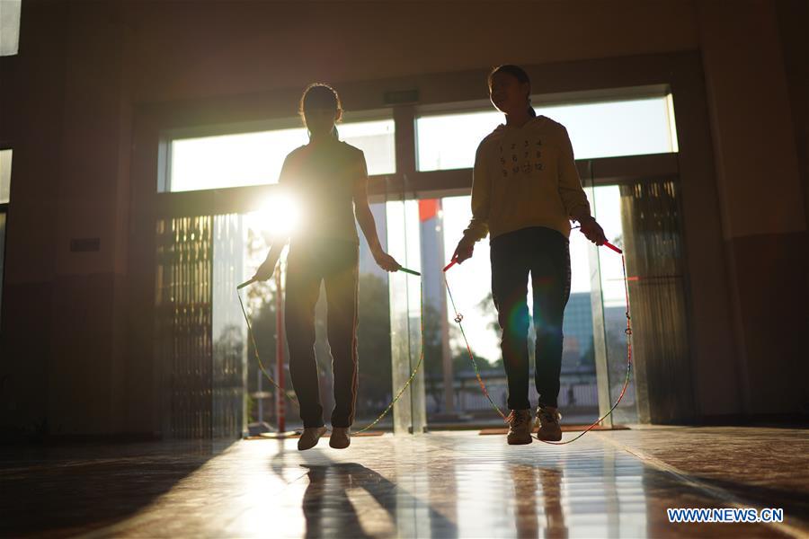 Photo taken on Oct. 12, 2020 shows Xiao Chenyun (L) and Fanziteng, members of the rope skipping team of Nanchang Municipal School for blind children, attending a training session in Nanchang, east China's Jiangxi Province. Consisting of 12 children with visual impairment, this rope skipping team has won multiple awards in several national competitions, including a women's pair title at the 10th National Games for People with Disabilities held in Tianjin in 2019. As their coach Xu Li said, children could benifit a lot from rope skipping exercise, learning to overcome difficulties while sufferring setbacks and living a better life. (Xinhua/Zhou Mi)