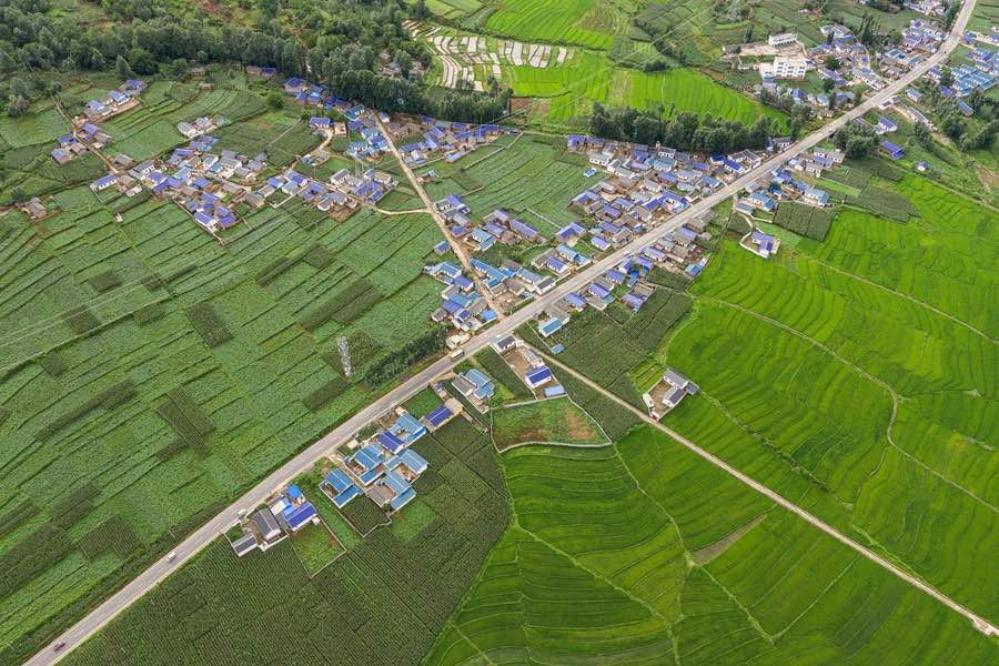 Aerial photo taken on July 2, 2020 shows a view of Erwu Village at Dimo Town in Zhaojue County, Liangshan Yi Autonomous Prefecture, southwest China's Sichuan Province. (Xinhua/Jiang Hongjing)