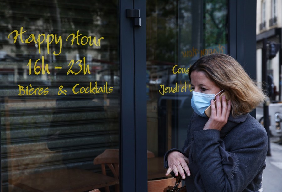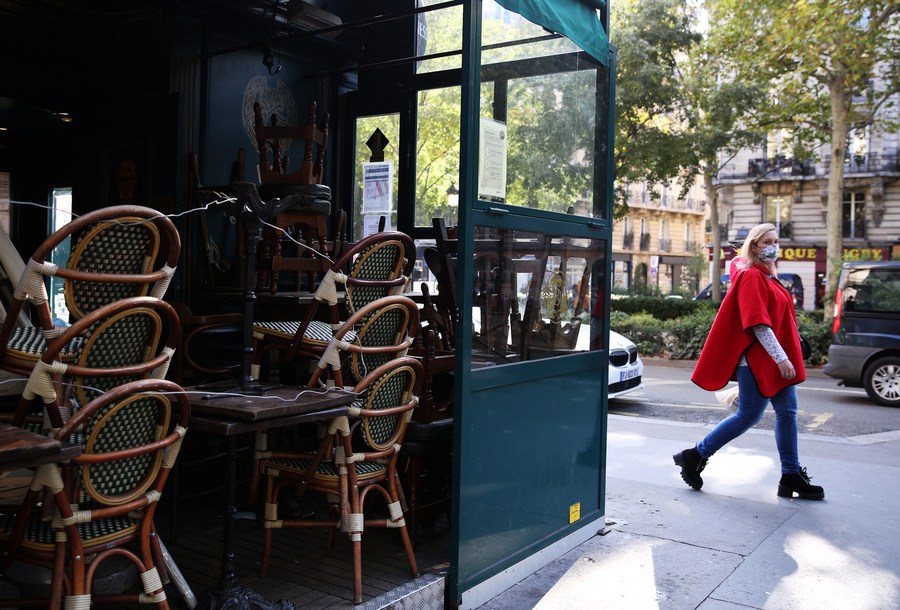 A woman wearing a face mask walks past a closed bar in Paris, France, Oct. 14, 2020. (Xinhua/Gao Jing)