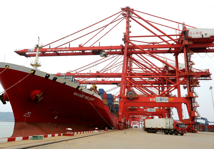 A vessel is being loaded at a container wharf at Lianyungang Port, east China's Jiangsu province, Oct. 13. Photo by Wang Chun/People's Daily Online