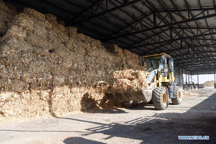 A worker driving a forklift conveys fodder at an animal husbandry company in Manas County, northwest China's Xinjiang Uygur Autonomous Region, Oct. 19, 2020. Manas introduced Suffolk sheep in 1989. The county has accumulated experience on sheep breeding and improved the quality of its mutton products. In recent years, local people have promoted their high-quality mutton products in the market in Beijing and Shanghai via e-commerce platform to boost villagers' income. (Xinhua/Ding Lei)