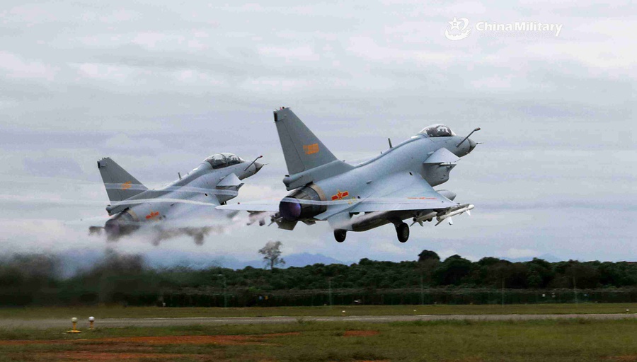 Two J-10 fighter jets attached to an aviation brigade of the air force under the PLA Southern Theater Command take off simultaneously from the runway during a ferry flight training exercise on October 16, 2020. (eng.chinamil.com.cn/Photo by Gu Haodong)