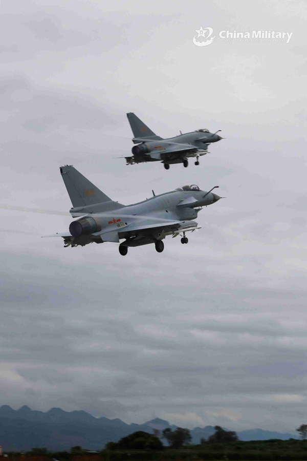 Two J-10 fighter jets attached to an aviation brigade of the air force under the PLA Southern Theater Command take off simultaneously from the runway during a ferry flight training exercise on October 16, 2020. (eng.chinamil.com.cn/Photo by Gu Haodong)