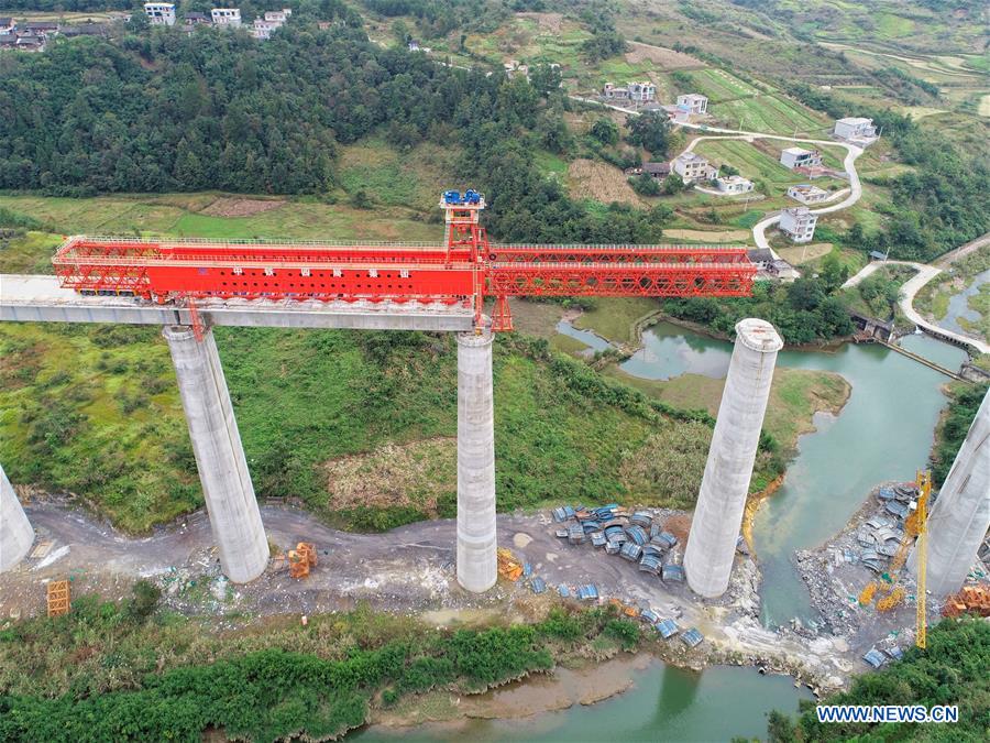 Aerial photo shows the construction of Yinpo River grand bridge of Guiyang-Nanning high-speed railway, in Dushan County, southwest China's Guizhou Province, Oct. 20, 2020. Guiyang-Nanning high-speed railway is designed with a maximum speed of 350 km per hour. (Xinhua/Liu Xu)