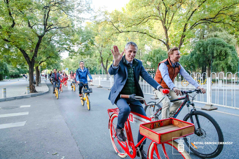 The newly appointed Ambassador of Denmark to China Thomas ?strup M?ller led a group of guests on a bike ride from the Embassy of the Kingdom of Denmark to the newly opened Liangma Riverfront Wednesday in Beijing, in a bid to promote environment-friendly commuting.