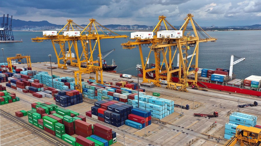 Aerial photo taken on Sept. 24, 2020 shows containers at Dalian port in northeast China's Liaoning Province. (Xinhua/Yao Jianfeng)