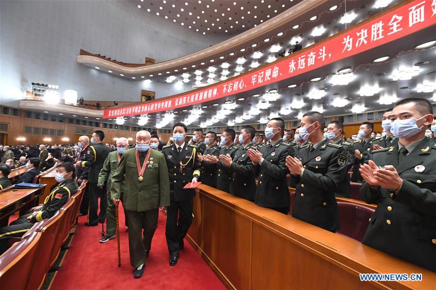Chinese People's Volunteers (CPV) veterans enter the venue of the meeting marking the 70th anniversary of the CPV entering the Democratic People's Republic of Korea to fight in the War to Resist U.S. Aggression and Aid Korea at the Great Hall of the People in Beijing, capital of China, Oct. 23, 2020. (Xinhua/Rao Aimin)