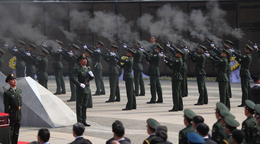 Soldiers fire a gun salute for martyrs killed in the 1950-53 Korean War at the Chinese People's Volunteers (CPV) martyrs' cemetery in Shenyang, northeast China's Liaoning Province, Sept. 28, 2020. (Xinhua/Yang Qing)