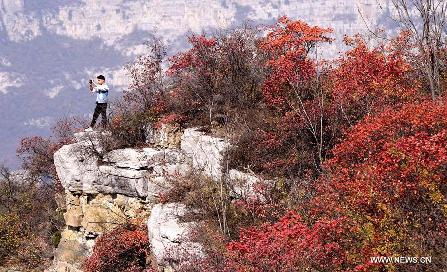 A tourist takes photos at the Qingtianhe scenic area in Boai County of Jiaozuo City, central China's Henan Province, on Oct. 22, 2020. (Xinhua/Zhu Xiang)