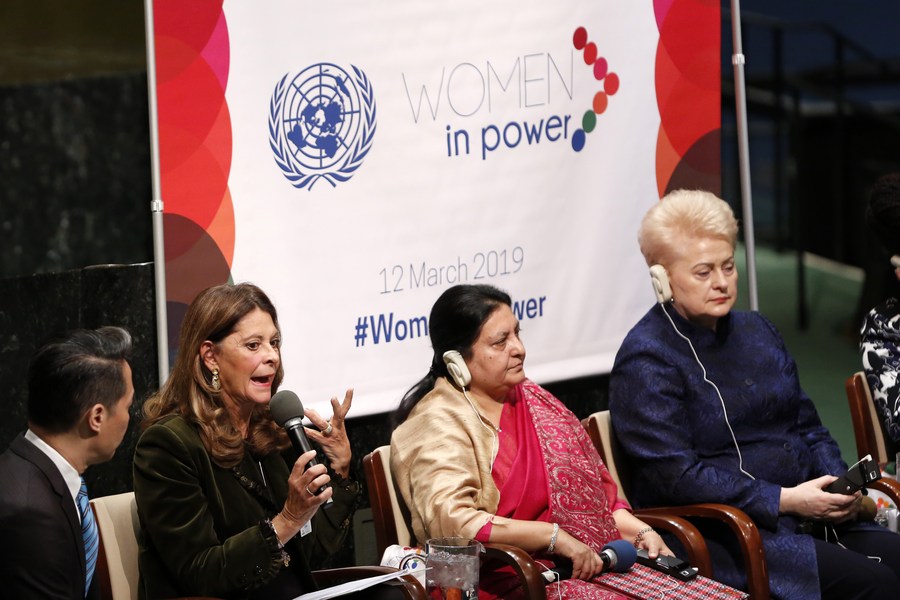 Colombian Vice President Marta Lucia Ramirez (2nd L) speaks during a round-table discussion of a high-level event on Women in Power at the UN headquarters in New York, on March 12, 2019. (Xinhua/Li Muzi)