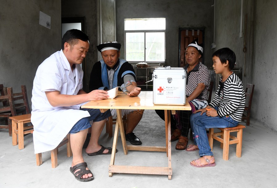 A village doctor (1st L) pays a visit to a local family at their new home inside a poverty-relief relocation site for the Baiku Yao People in Nandan County, south China's Guangxi Zhuang Autonomous Region, Aug. 6, 2020. (Xinhua/Lu Boan)