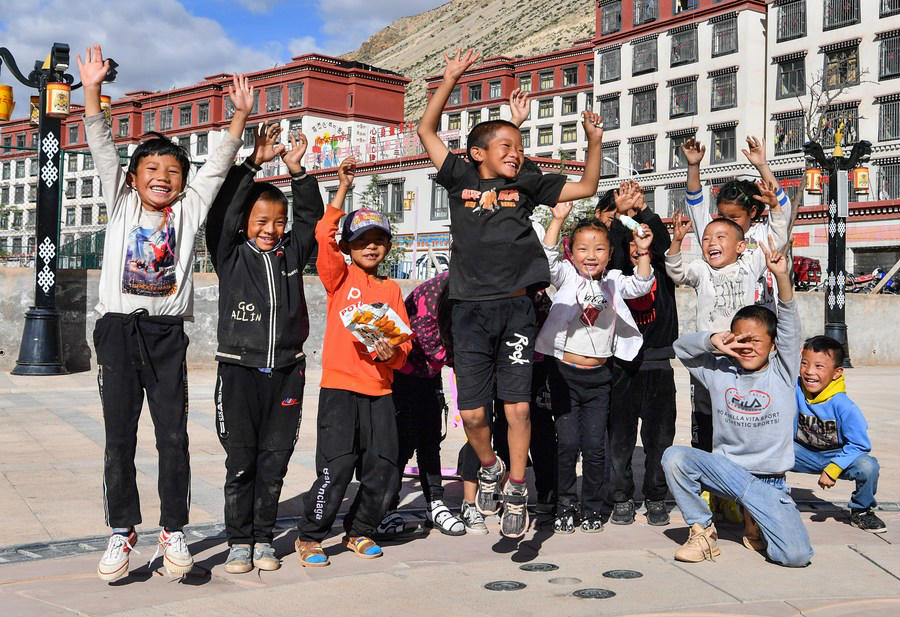 Children hail as they play at a relocation site in Baxoi County, southwest China's Tibet Autonomous Region, Sept. 19, 2020. (Xinhua/Jigme Dorje)