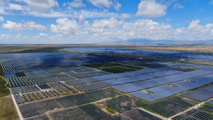 Aerial photo taken on Aug. 17, 2020 shows a photovoltaic power station at the green industrial development park in the Tibetan Autonomous Prefecture of Hainan, northwest China's Qinghai Province. (Xinhua/Zhang Long)