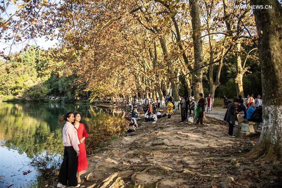 Tourists enjoy autumn scenery at Huaxi National City Wetland Park in Guiyang, capital of southwest China's Guizhou Province, Oct. 25, 2020. (Xinhua/Tao Liang)
