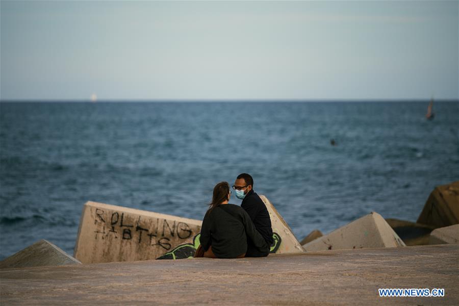 A couple enjoy their leisure time by the seaside in Barcelona, Spain, on Oct. 25, 2020. Spanish Prime Minister Pedro Sanchez on Sunday announced a State of Alarm in an attempt to halt the spread of coronavirus, days after Spain became the first European Union state to pass the grim one-million-case mark. (Photo by Joan Gosa/Xinhua)