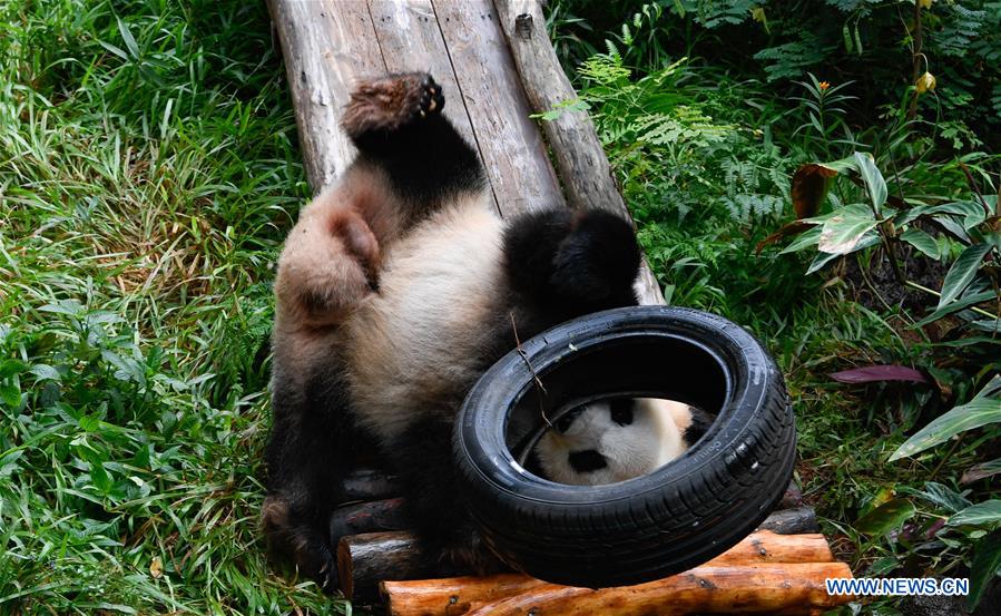 Giant panda Gonggong plays outside at Hainan Tropical Wildlife Park and Botanical Garden in Haikou, capital city of south China's Hainan Province, Oct. 26, 2020. (Xinhua/Yang Guanyu)