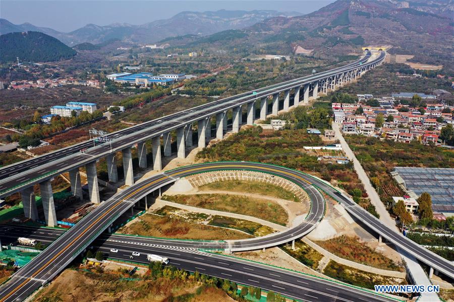Aerial photo taken on Oct. 26, 2020 shows the Jinan-Tai'an expressway in east China's Shandong Province. The expressway linking Jinan and Tai'an in east China's Shandong Province will be put into operation soon. The expressway will shorten the travel time between the two places to half an hour after its operation. (Xinhua/Xing Guangli)