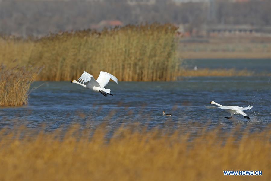 Swans fly in the Luoping Lake area in Zhangjiakou, north China's Hebei Province, Oct. 26, 2020. (Photo by Wu Diansen/Xinhua)