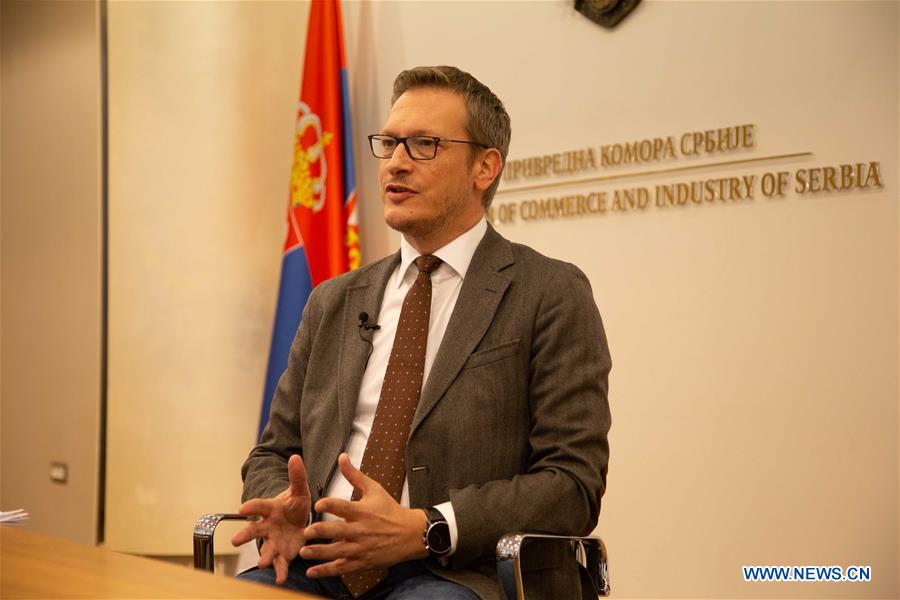 Mihailo Vesovic, director of the Division for Strategic Analyses, Services and Internationalization at the Serbian Chamber of Commerce and Industry (PKS), is interviewed with Xinhua in Belgrade, Serbia, on Oct. 22, 2020. In spite of the challenges posed by the COVID-19 pandemic, Serbia looks forward to presenting its products at the upcoming China International Import Expo (CIIE) in Shanghai with the aim of expanding its exports, Mihailo Vesovic told Xinhua in a recent interview. (Xinhua/Shi Zhongyu)