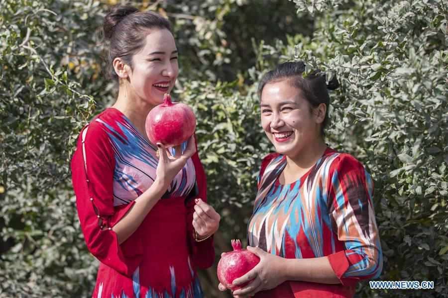 Farmers pick megranates in Pishan County of Hotan, northwest China's Xinjiang Uygur Autonomous Region, Oct. 8, 2020. In summer and autumn, the vast land in Xinjiang embraces the harvest season. (Photo by Adil Nadir/Xinhua)