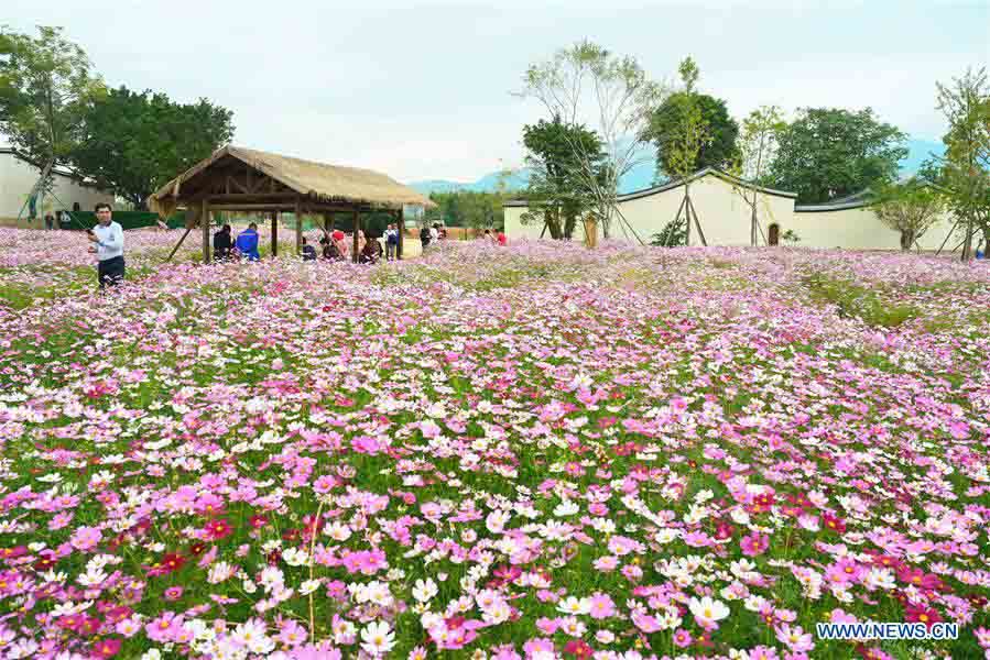People visit a flower field at the Liangcuo historical community in Cangshan District of Fuzhou, southeast China's Fujian Province, Oct. 21, 2020. (Xinhua/Lin Shanchuan)