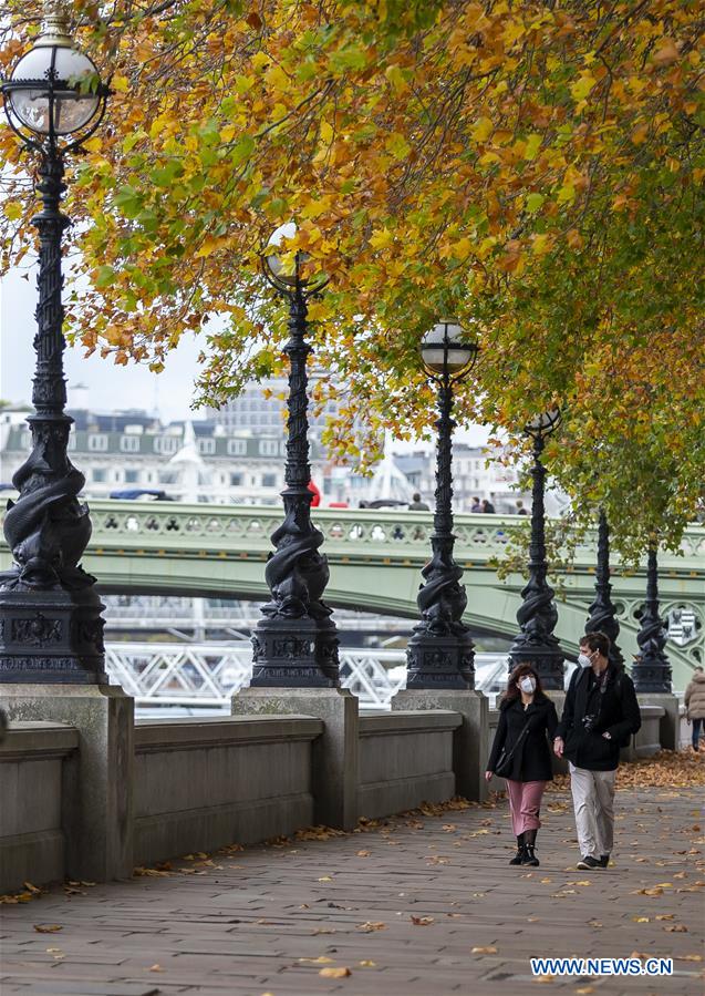 People wearing face masks walk by the River Thames in London, Britain, on Oct. 28, 2020. Another 24,701 people in Britain have tested positive for COVID-19, bringing the total number of coronavirus cases in the country to 942,275, according to official figures released Wednesday. The coronavirus-related deaths in Britain rose by 310 to 45,675, the data showed. (Xinhua/Han Yan)