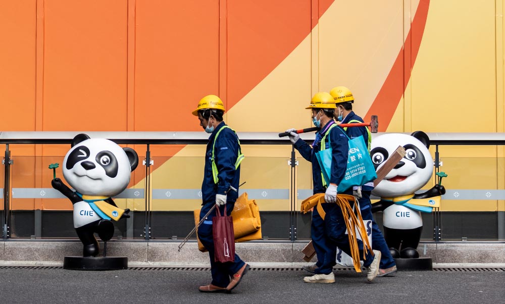 Workers pass by an exhibition hall of the third China International Import Expo in Shanghai on Thursday. The expo will open on Wednesday. [Photo by Wu Jun/For China Daily]