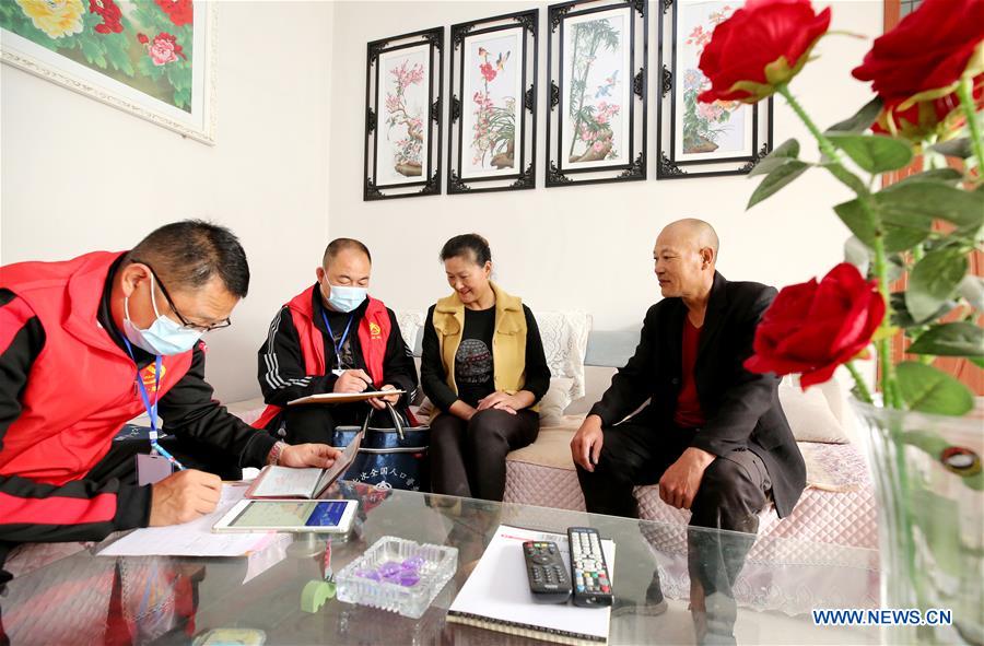 Census takers register residents' information of a household in Qidong Village of Qicun Town, Zaozhuang City of east China's Shandong Province, Nov. 1, 2020. China on Sunday started its seventh national population count, with about 7 million census takers going door to door to document demographic changes in the world's most populous country. (Photo by Sun Zhongzhe/Xinhua)