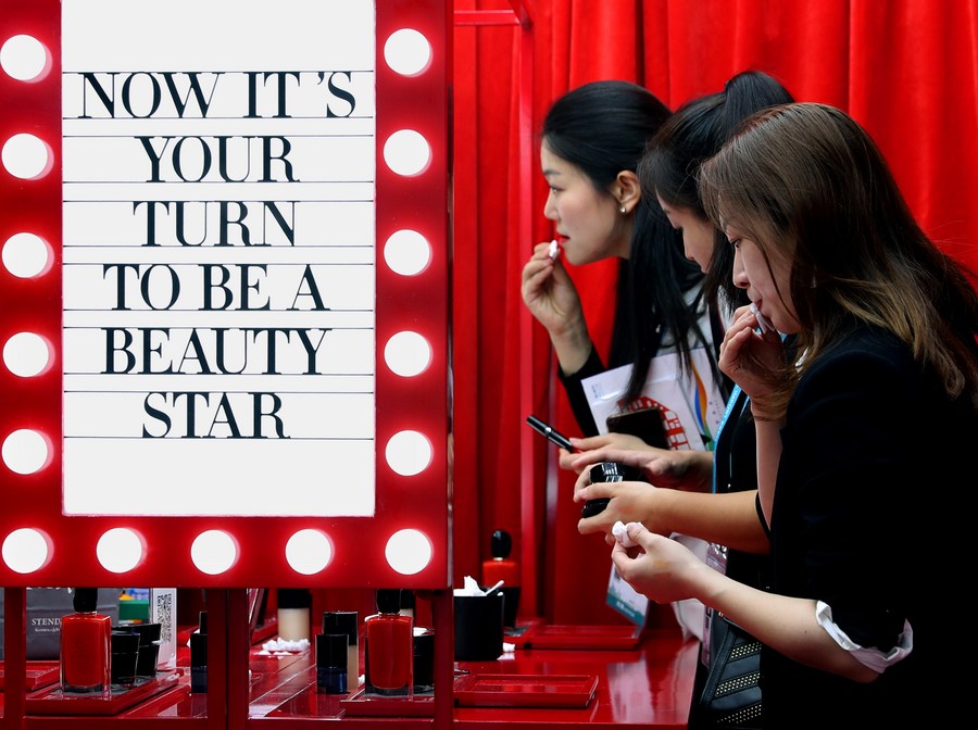 Visitors try lipsticks at a booth of L'Oreal at the second China International Import Expo (CIIE) in east China's Shanghai, Nov. 6, 2019. (Xinhua/Liu Ying)