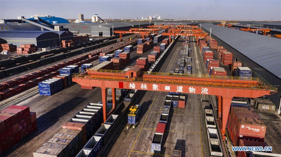 Aerial photo taken on Oct. 31, 2020 shows a view of Yulin Xiangdao International Logistics Park in Yulin City, northwest China's Shaanxi Province. Since the operation in June of 2019, Xiangdao International Logistics Park has sent 16.87 million tonnes of goods, among which 96 percent were coal. (Xinhua/Tao Ming)